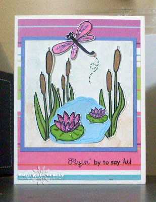 I don't usually do glitter. Not much call for it in a house full of boys! LOL! It was fun to make(and messy). I used some fun-flock on the cattails too, but I couldn't get a good pic of it. So it's furry and glittery. A bit much going on for one card but, that's alright! I wish I had made the "pond" bigger it probably would look better. I made the water by freehand cutting the blue cardstock that came in the kit and then used a light blue pen to doodle ripples.